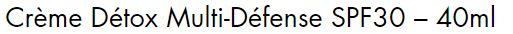 On nous annonce un bouclier performant grâce à la Crème Détox Multi-Défense SPF30. Les radicaux libres et rayons UV responsables du vieillissement cutané sont piégés pour une peau durablement protégée des méfaits du temps. Jour après jour, ses actifs brevetés améliorent la qualité de la peau pour révéler un teint visiblement plus jeune et dégrisé. Parfaitement détoxifiée et préservée de la pollution, la peau est hydratée et lumineuse.