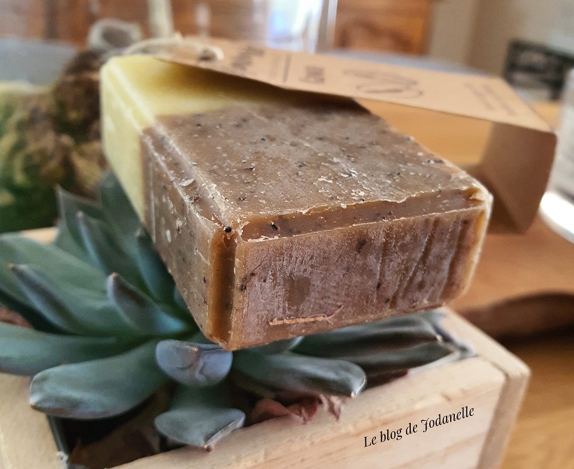 J’ai choisi de recevoir des savons petit format – 90 g mais la gamme est disponible en 115 g ~ 2 possibilités : prix serré en vrac (sans cordelette et sans étiquette) tout emballé (étiquette kraft + cordelette en lin)